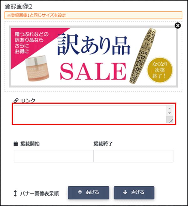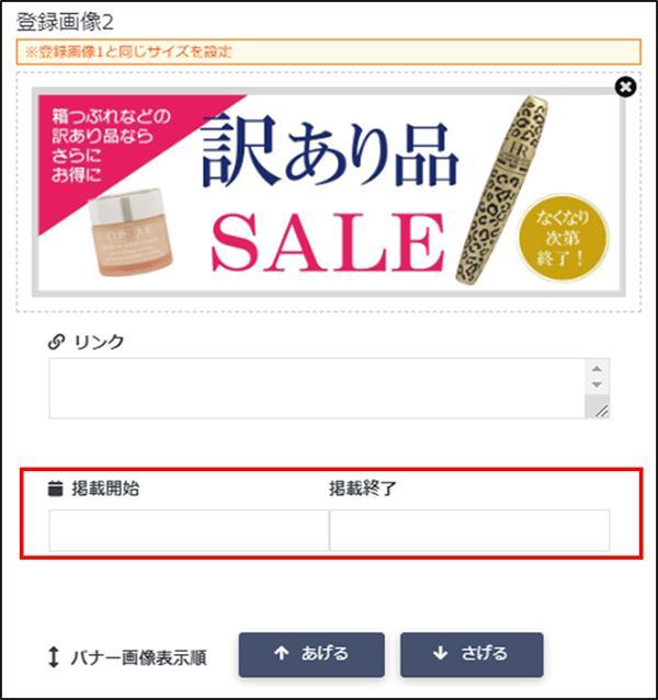 バナー画像を1枚以上登録すると、画像の下に「掲載開始」と「掲載終了」の表⽰がでます。