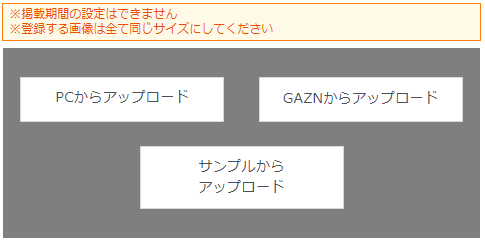 ⾚枠部分にカーソルを移動させると「PCからアップロード」、「GAZNからアップロード」、「サンプルからアップロード」のボタンが表⽰されます。