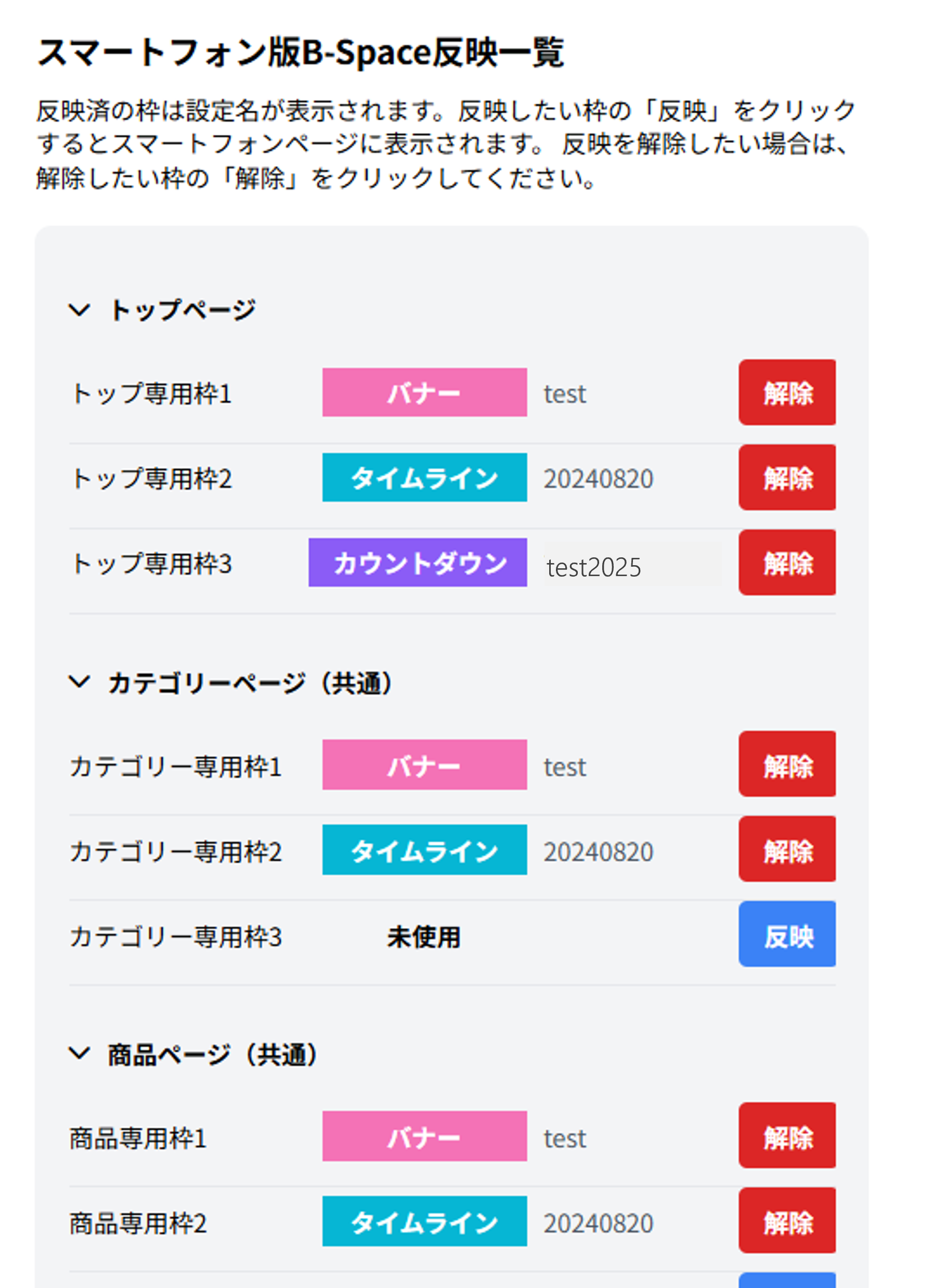 すでに他の設定を反映している専⽤枠へ、新しく作った設定を反映したい場合は、新しく作った設定の編集画⾯から、「スマートフォン版B-Space反映⼀覧」を開いて反映させたい枠の「解除」を押してから、「反映」ボタンを押してください。