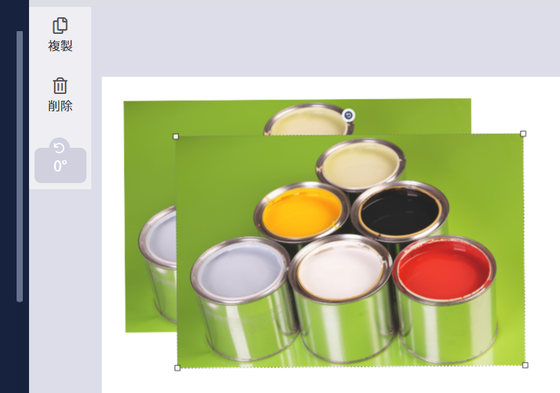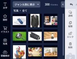 左メニューから「写真」を押すと追加可能な写真一覧が表示されます。追加したい写真をクリックすると、キャンバス上に選択した写真が追加されます。