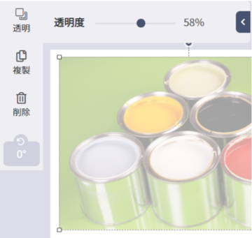透明にしたい写真を選択し「透明」を押すと透明度を調整できます。