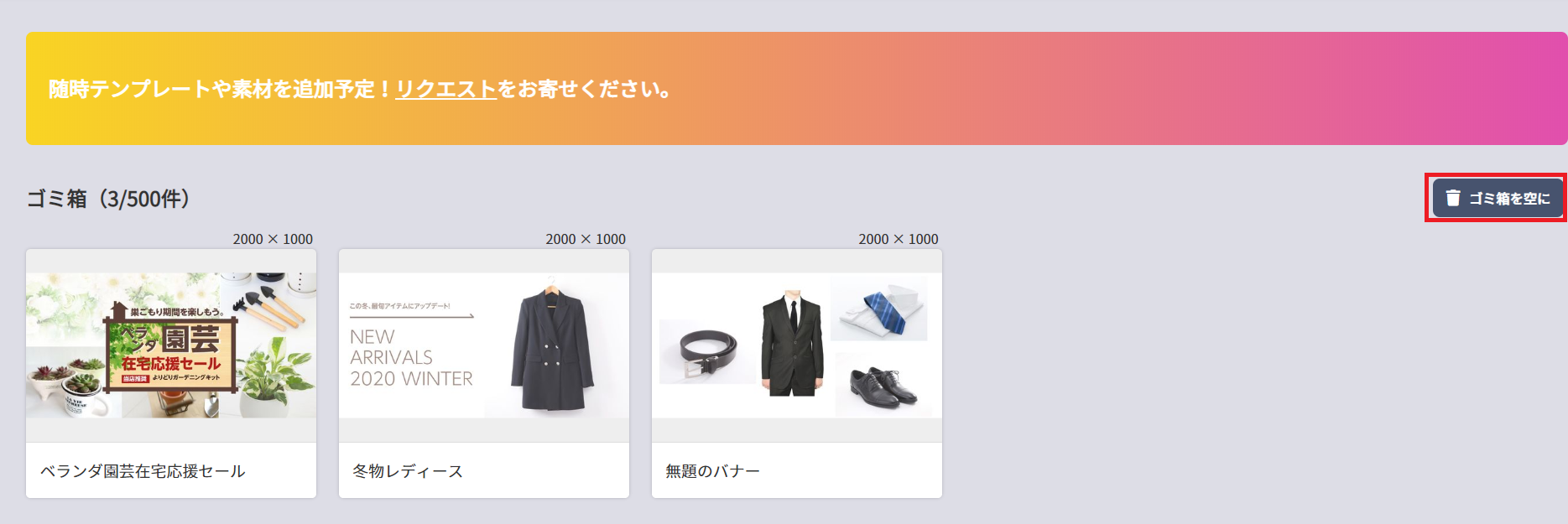 ページ右上の「ゴミ箱を空に」を選択すると、確認メッセージが表示され「削除」を選択すると、画像はすべて削除されます。