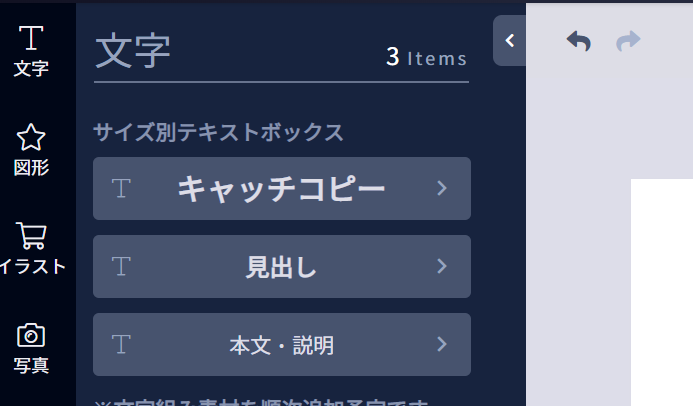 メニューから「文字」を選択すると、3つのアイテムから「サイズ別テキストボックス」が選択できます。